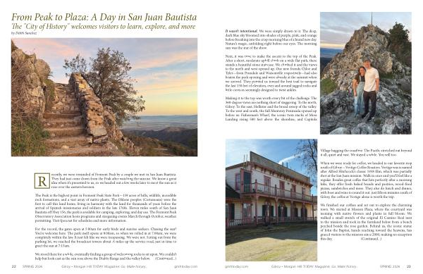 Making it to the top was worth every bit of the challenge. The 360-degree views are nothing short of staggering. To the north, Gilroy. To the east, Hollister and the broad sweep of the valley. To the west and south, the full Monterey Peninsula opened up before us: Fisherman’ s Wharf, the iconic twin stacks of Moss Landing rising 500 feet above the shoreline, and Capitola