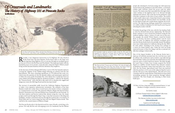 In the last issue of Gilroy Morgan Hill Today, I wrote of the first Spanish explorers crossing the ridgeline of the Gabilan Range following an arduous trail into San Juan Bautista. The Anza colonizing expeditions of 1776 followed this route, too; which raises the question of why the Spanish soldiers and missionaries opted not to follow the more gentle Prunedale Pass. Most likely there would have been an easier Indian trail leading through the sandstone boulders— called by the Spanish the " Pinecate Rocks ". And, why did it take until 1932 to abandon the rugged and dangerous routes the Old Stage Road and the San Juan Grade?